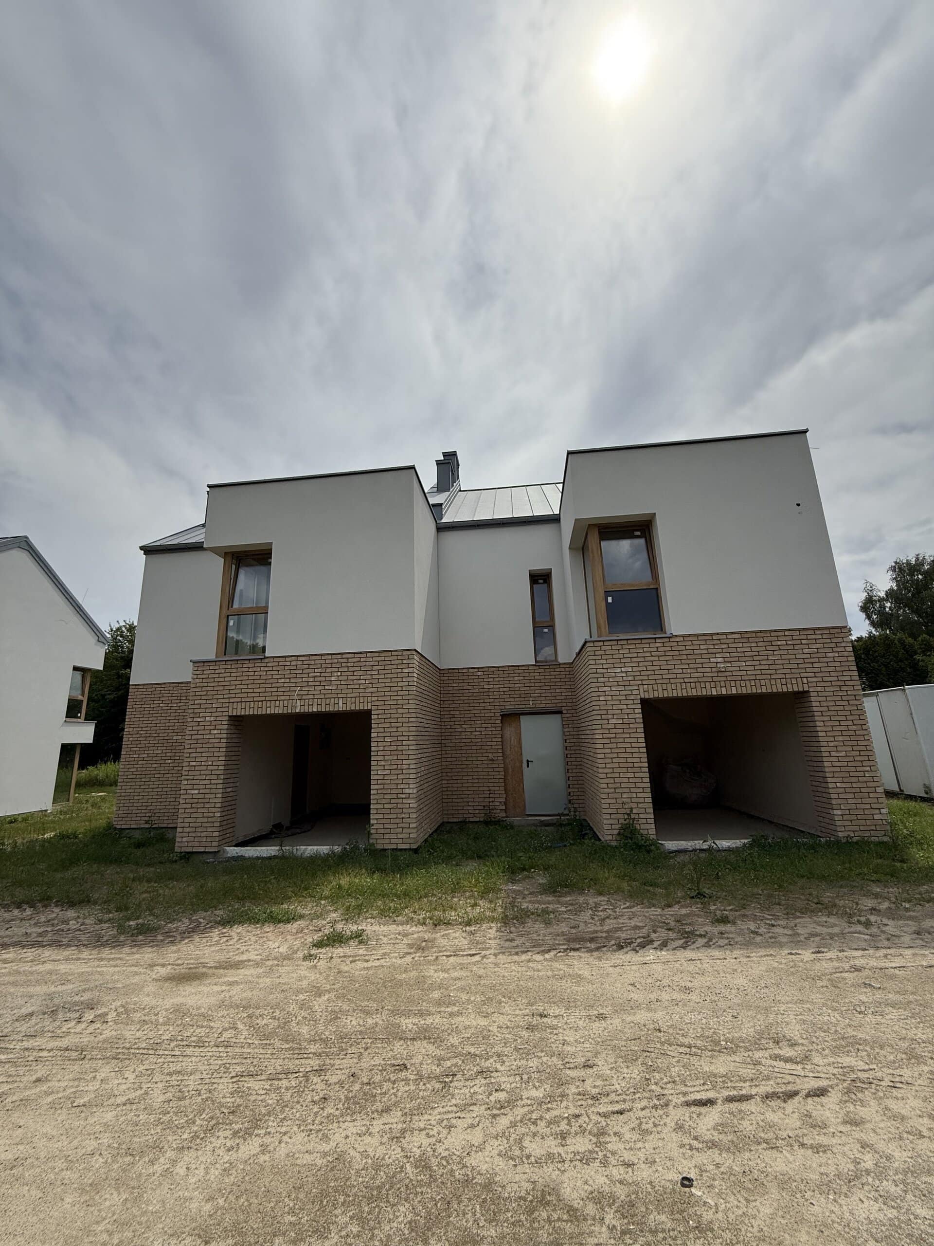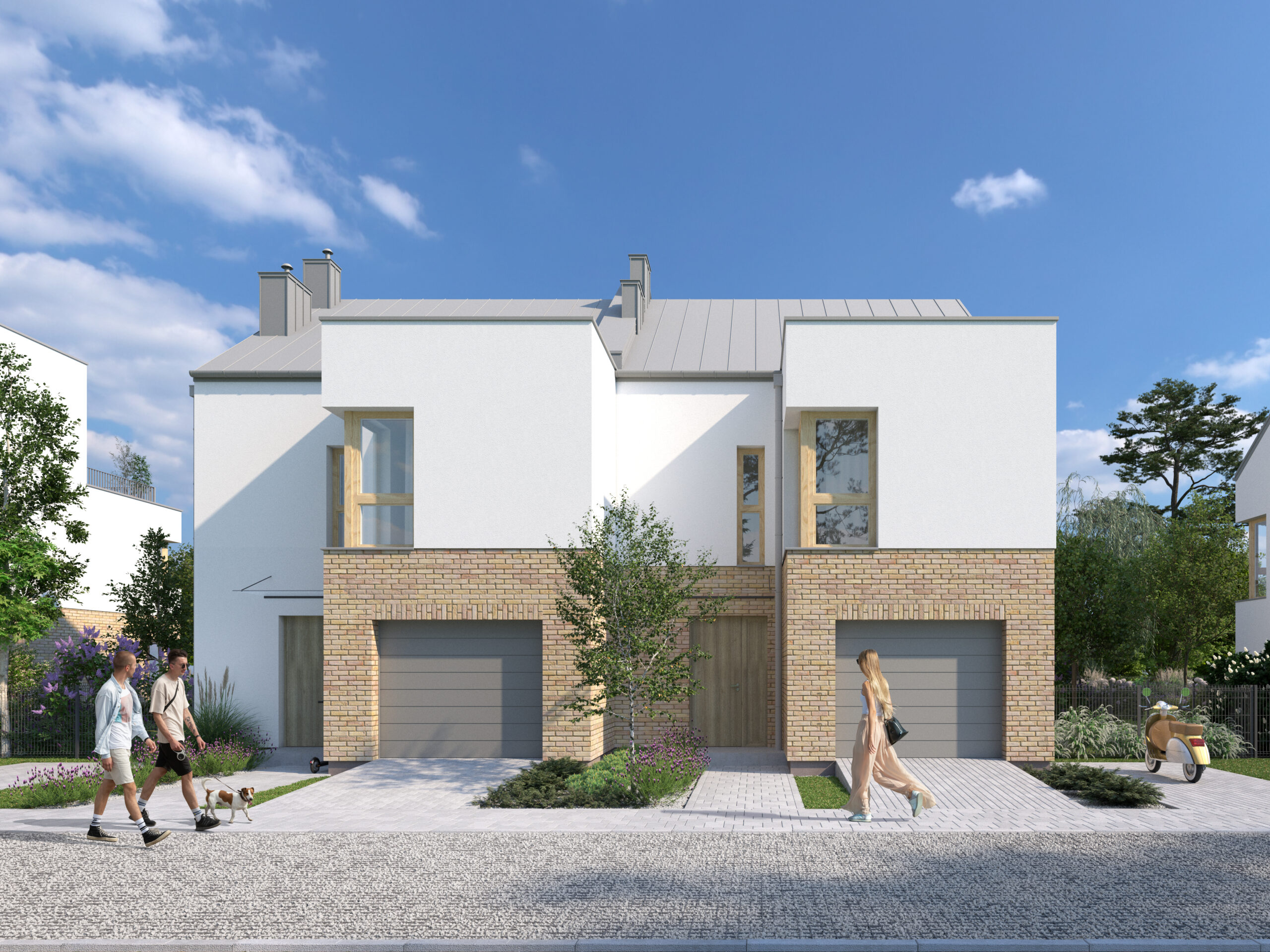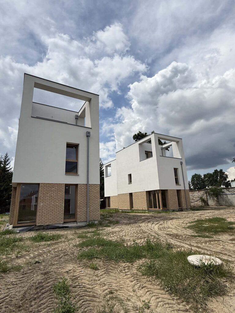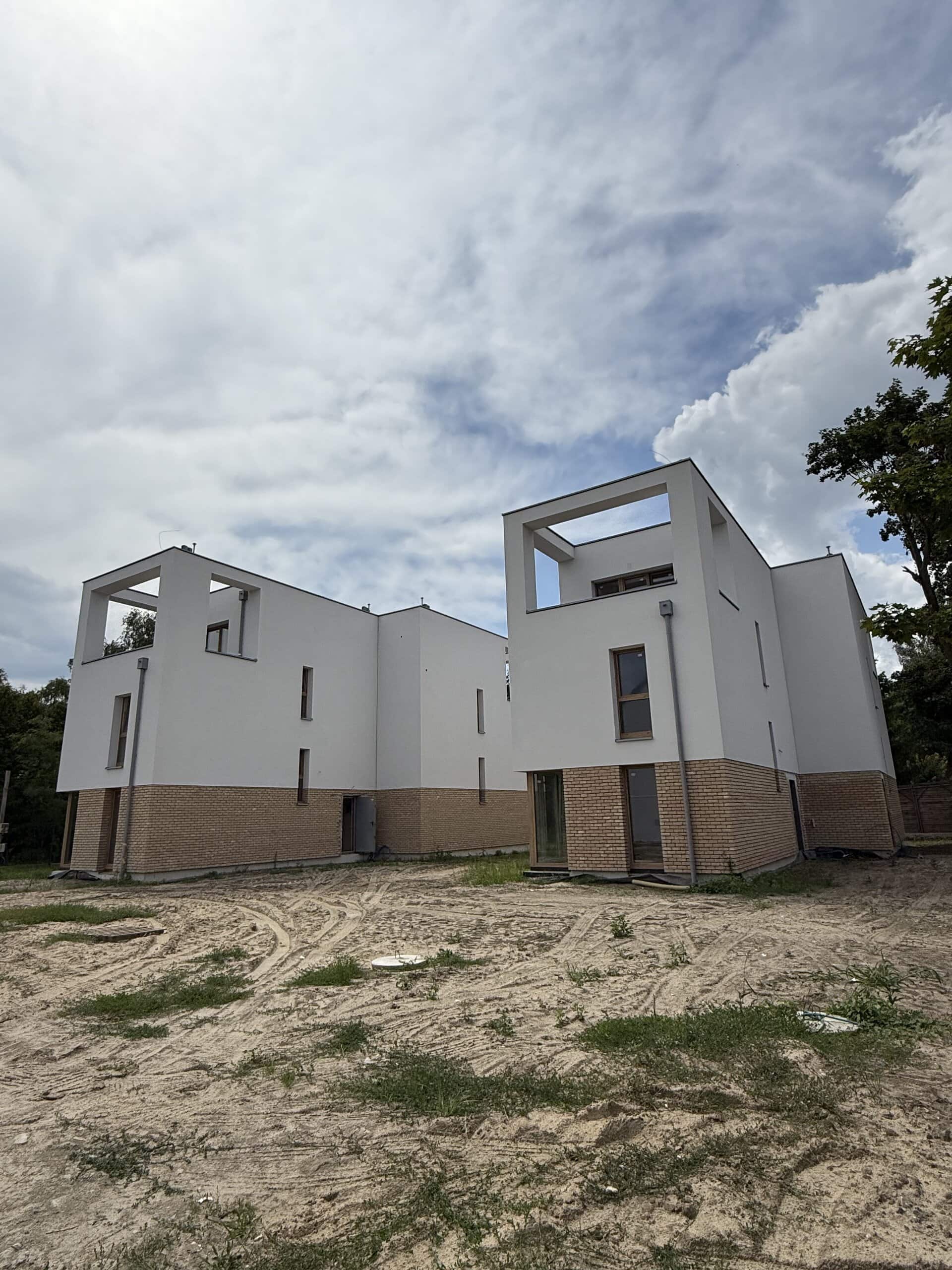 Część elewacji wykonana jest ze specjalnie wypalanej cegiełki klinkierowej, która nadaje domom niepowtarzalny wygląd. Razem z jasnym tynkiem na elewacjach, użytą w strefie wejść okładziną elewacyjną w odcieniach szaro – piaskowych, zewnętrzną stolarką okienną w kolorze ciepłego dębu oraz pokryciami dachowymi w odcieniach szarości wszystkie zaprojektowane elementy tworzą spójną całość o nowoczesnym charakterze.