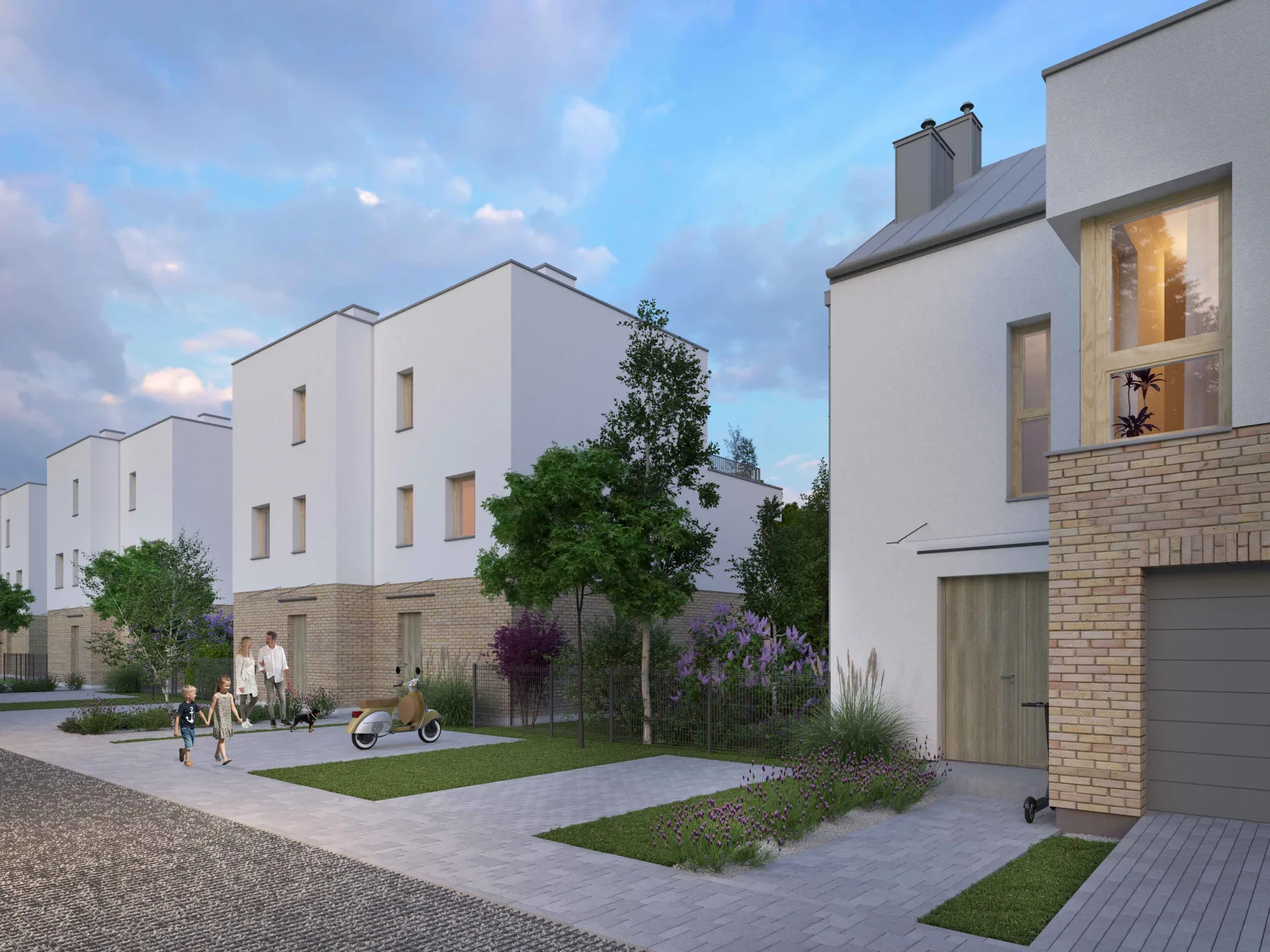 Do każdego domu przypisany jest ogródek o powierzchni od 135 do 235 m2. Do domów mniejszych przypisane są 2 miejsca postojowe, domy 120 m2 mają 1 miejsce postojowe i garaż.